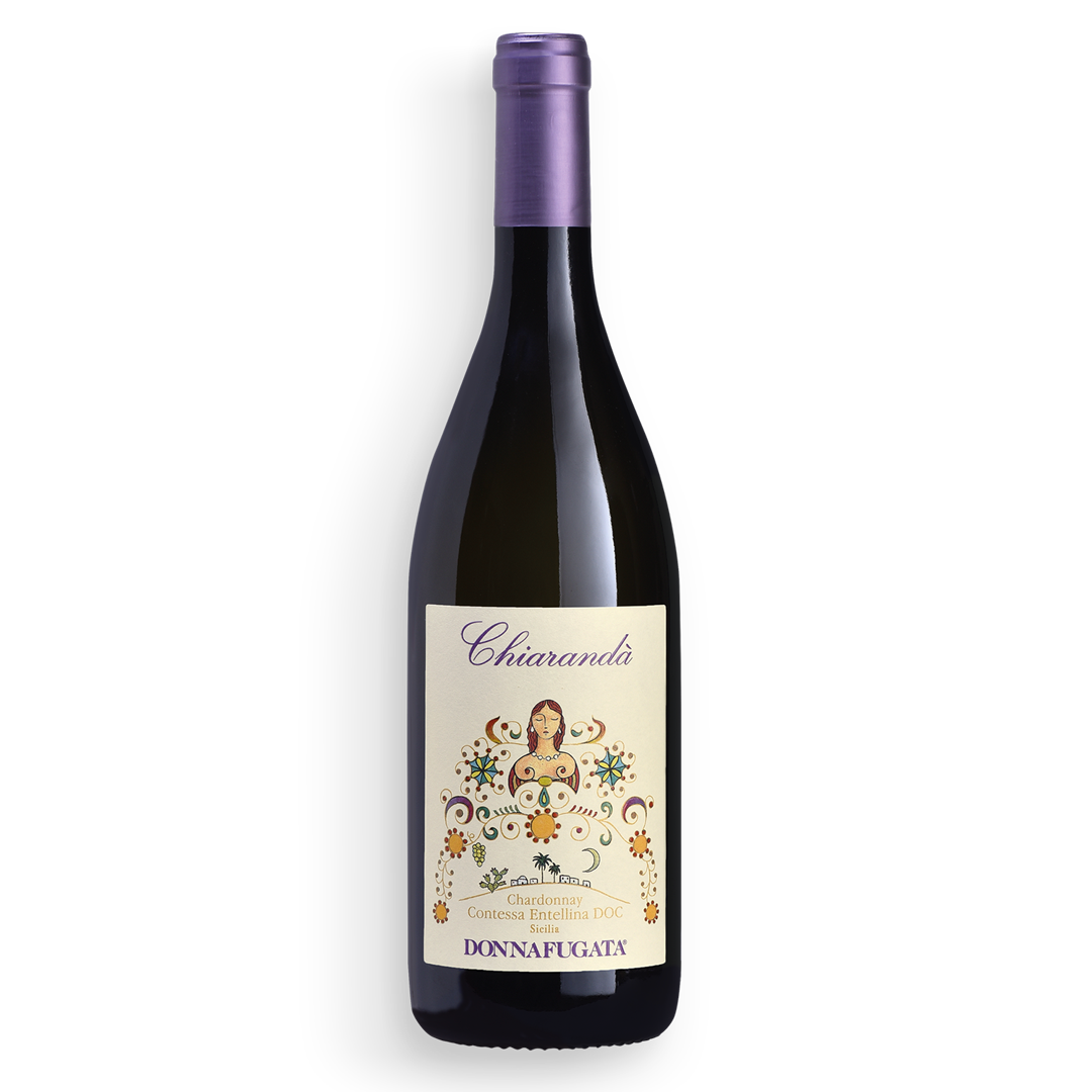 Come in molte etichette dei vini bianchi di Donnafugata, la protagonista è una donna con gli occhi incantevolmente chiusi. Nell’illustrazione del Chiarandà la figura femminile, posta sul piedistallo, si arricchisce di decorazioni geometriche e naturalistiche che ne accentuano levità ed ariosità. Un’immagine in cui tutto parla di Sicilia. I capelli scuri che incorniciano il volto della nobildonna, le girandole ed i ramage della più raffinata arte orafa siciliana, il fico d’india e la palma della natura e della ceramica, il grappolo dorato dello Chardonnay. Un’immagine complessa ed elegante specchio del vino-gioiello di Donnafugata.